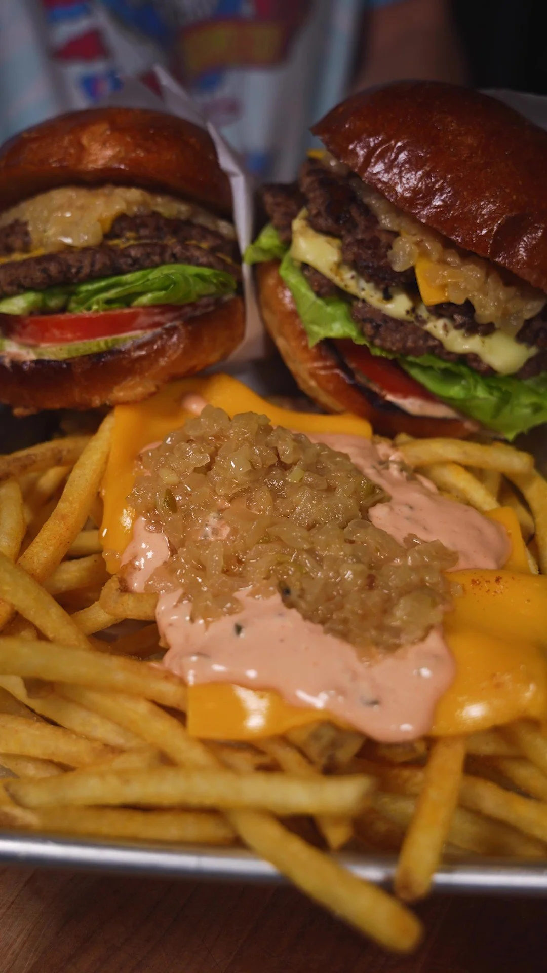 4. To construct the burger, place down the bottom bun covered with spread, pickles, tomatoes, lettuce, two smash burger patties, a large scoop of the caramelized onions, and the top bun.