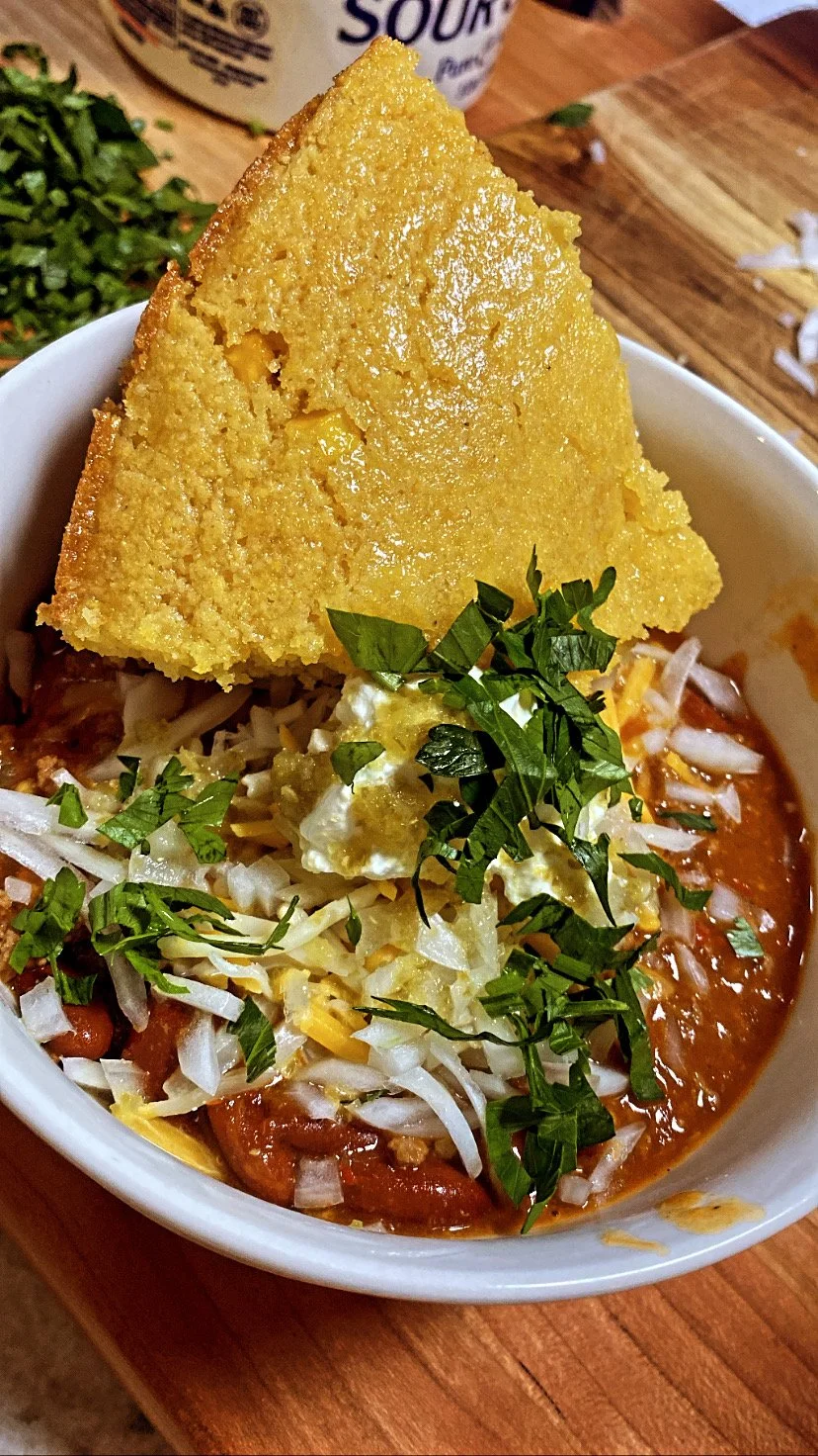 1. In a small bowl, place in two scoop of freshly made macaroni, followed by a hearty serving of the chili, a sprinkle of dice onions, shredded cheese, a dallop of sour cream and finally the sweet and delicious cornbread. Make sure to get everything in one bite and Enjoy!