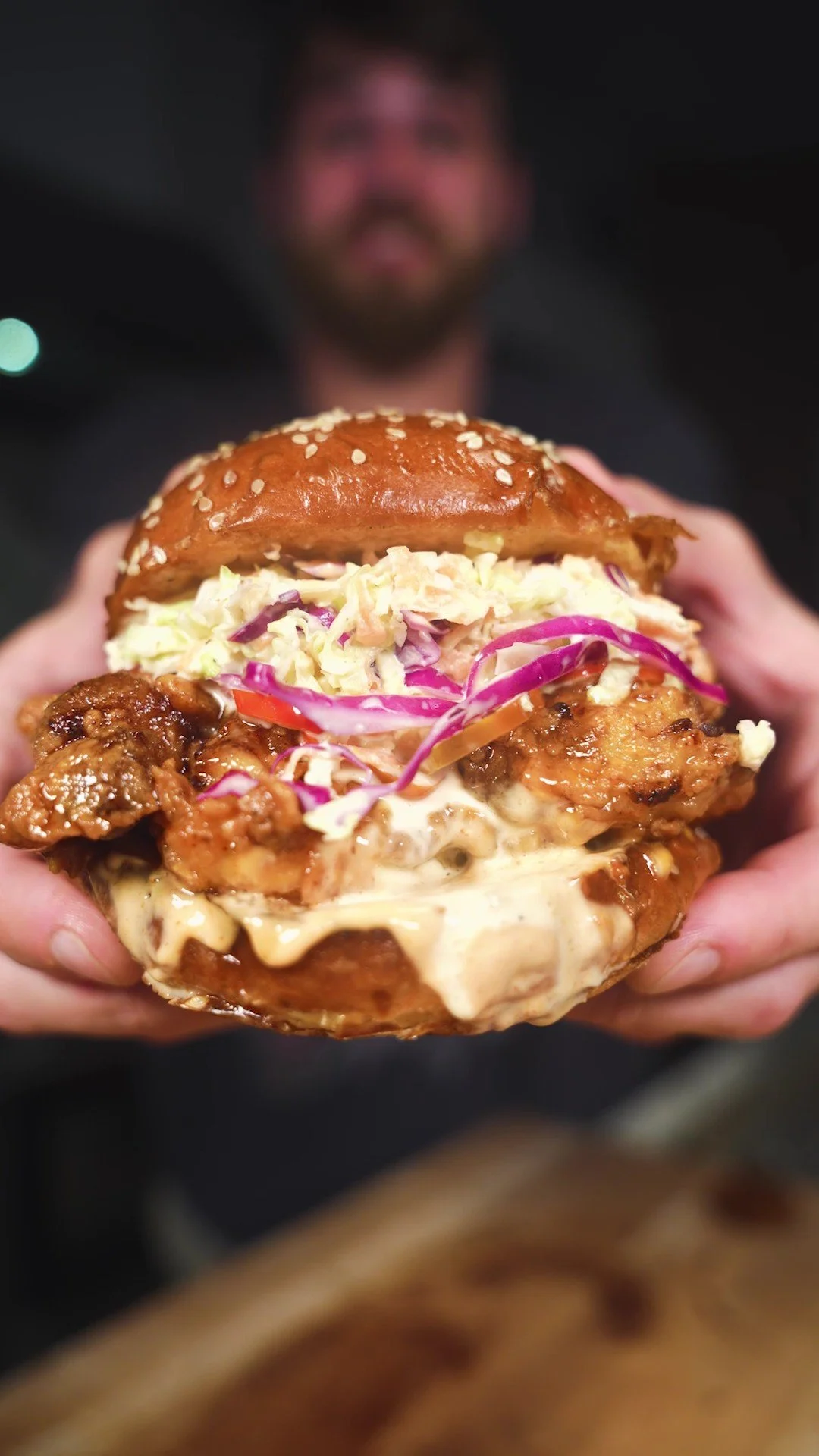 1. To construct the sandwich, place down your toasted bottom bun covered with sriracha mayo, followed by the hot honey chicken, pickled peppers, a handful of coleslaw and finally the toasted top bun covered with more sriracha mayo. Enjoy!