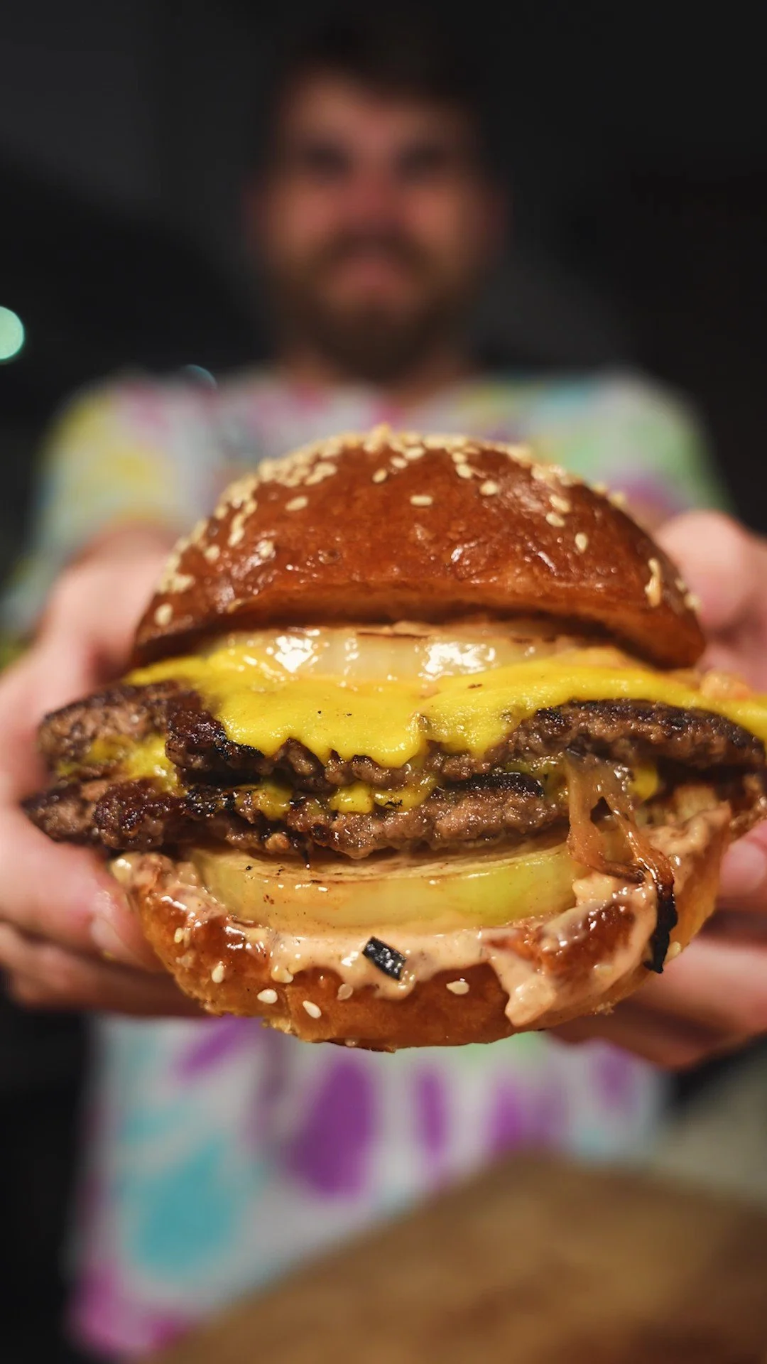 4. To construct the burger, place down the bottom bun covered with animal sauce, cooked onion ring, two smash burger patties, another onion ring, and the top bun smothered with more animal sauce. Enjoy!